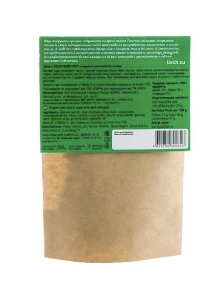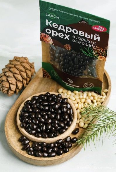 Ядра Кедрового орешка, собранного в глухой тайге Томской области, покрытые тонким слоем натурального 100% шоколада из колумбийских какао бобов и какао масла. В линейке представлены драже как с сахаром, так и без него. В зависимости от предпочтений в ассортименте имеется драже в горьком и молочном шоколаде без рафинированного белого сахара и в белом шоколаде с ароматными ягодами брусники и облепихи.