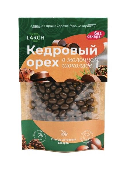 Ядра Кедрового орешка, собранного в глухой тайге Томской области, покрытые тонким слоем натурального 100% шоколада из колумбийских какао бобов и какао масла. В линейке представлены драже как с сахаром, так и без него. В зависимости от предпочтений в ассортименте имеется драже в горьком и молочном шоколаде без рафинированного белого сахара и в белом шоколаде с ароматными ягодами брусники и облепихи.