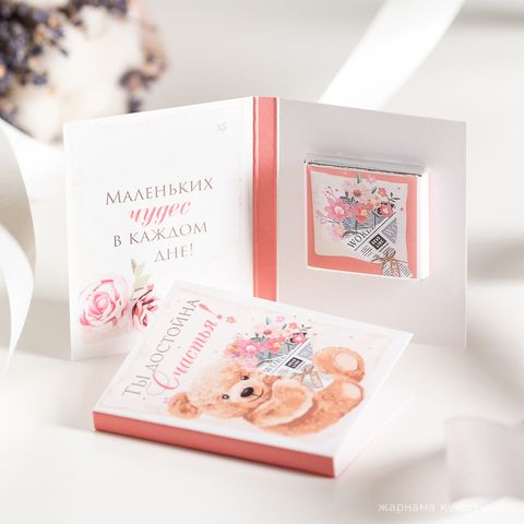 Размер мини-открытки (в сложенном виде): Ш 55 х В 70 х Г 5 мм. Материал: картон. Внутри 1 шоколадка (вес: 5 гр., размер: 31 х 31 мм.) Шоколадка упакована в индивидуальную этикетку с пожеланием. Состав: сахар, какао масло, сухое цельное молоко, какао тертое, эмульгатор соевый лецитин, натуральный ароматизатор ваниль. Срок годности шоколада: 18 мес. Производитель шоколада: фабрика "Монетный двор Универс"