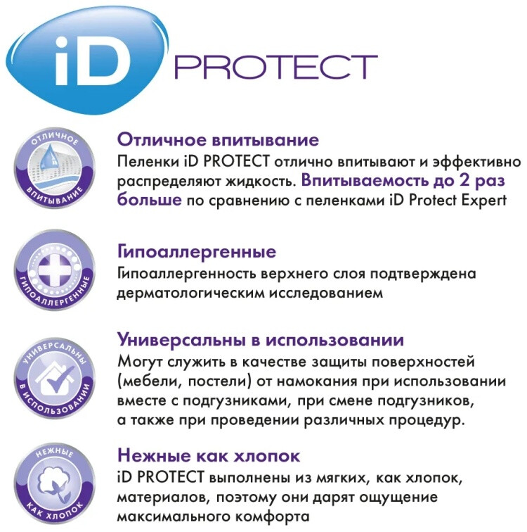 Одноразовые пеленки iD PROTECT - это надежное и простое решение для ухода за пациентами и пожилыми людьми, а также создания комфортных условий для малышей в детских учреждениях. С их помощью вы можете быть уверены в чистоте и гигиеничности любого пространства. Обеспечьте себя и своих близких заботой и защитой с одноразовыми впитывающими пеленками iD PROTECT.