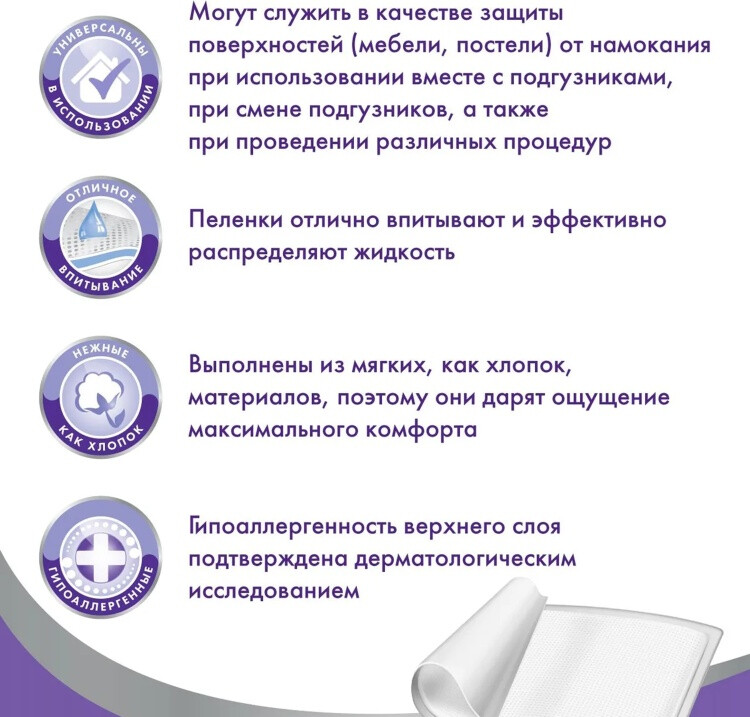 Эти пеленки предназначены для людей любого возраста, включая тех, кто нуждается в особом уходе, например, пожилых людей или детей. Благодаря своей высокой впитывающей способности, они эффективно удерживают влагу и обеспечивают ощущение сухости на длительное время. Это особенно важно для обеспечения комфортных условий как в повседневной жизни, так и в условиях болезни или послеоперационного восстановления.