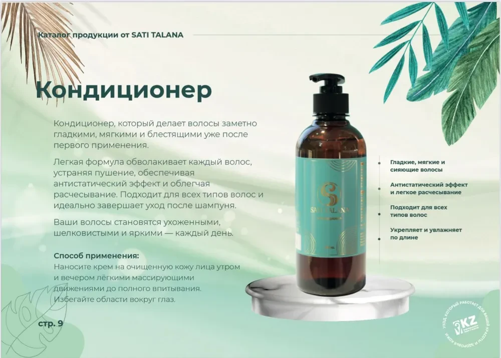 Кондиционер. Придает гладкость и блеск волосам.Обеспечивает антистатический эффект. Подходит для всех типов волос. Применение: Нанести необходимое количество на очищенные влажные волосы и распределить по длине, через 3-5 минут тщательно смыть водой. Меры предосторожности: только для наружного применения. Беречь от детей. При попадании в глаза тщательно промыть водой. Условия хранения: хранить в сухом, прохладном месте, при температуре от +5 до +25 °С. Срок годности: 36 месяцев с даты производства.