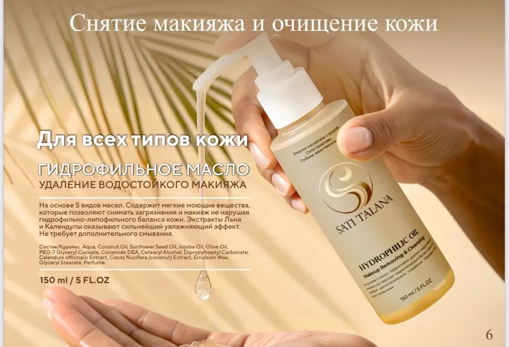 Гидрофильное масло при контакте с водой превращается в кремовую эмульсию, которая помогает снимать макияж, не травмируя кожу.Содержит мягкие моющие вещества, которые позволяют снимать загрязнения, не нарушая гидрофильно-липофильного баланса кожи.Экстракты Льна и Календулы оказывают сильнейший увлажняющий эффект.Применение:Нанесите небольшое количество масла на влажную кожу легкими массирующими движениями. После смойте теплой водой.