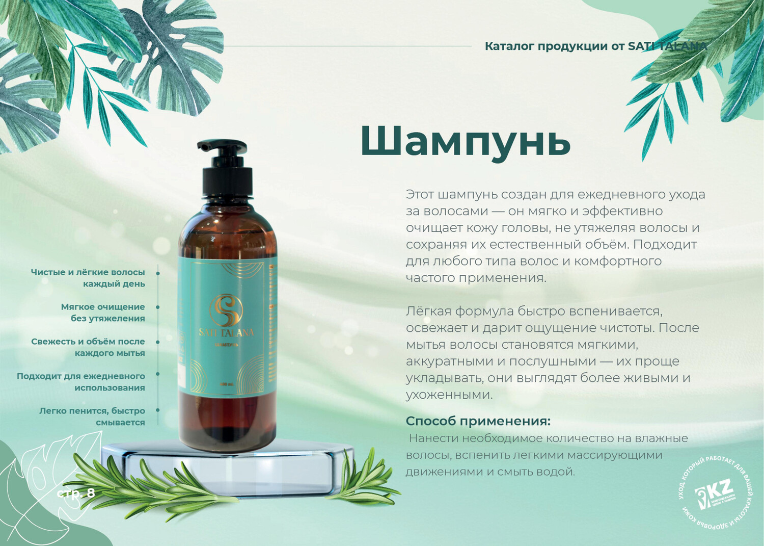 Шампунь. Эффективно очищает волосы и кожу головы, без утяжеления волос. Подходит для частого применения. Применение: Нанести необходимое количество на влажные волосы, вспенить легкими массирующими движениями и смыть водой. Меры предосторожности: только для наружного применения. Беречь от детей. При попадании в глаза тщательно промыть водой. Условия хранения: хранить в сухом, прохладном месте, при температуре от +5 до +25 °С. Предохранять от прямых солнечных лучей. Срок годности: 36 месяцев с даты производства. Сделано в Казахстане.